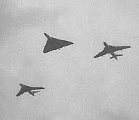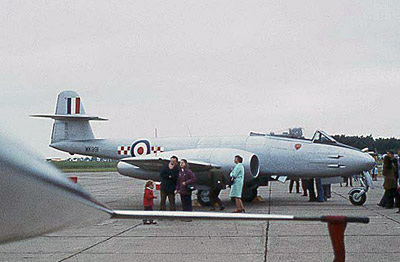 The annual Battle of Britain displays were very much a family event, with coaches bringing people in from all the surrounding villages. EVERYBODY went to the 'At Home' days old and young. You would see everyone you knew there people with no knowledge or interest in aviation but there for what was probably the last day out of the summer. It always seemed to coincide with the swarms of Cranefly that we see in September why do I remember that! People that read their newspapers were 'in the know' as far as aircraft went, and these days of the fifties were the time when Britain was a world player in the manufacturing stakes. Two events spring to mind first the appearance, albeit static only, of the only Short Sperrin which I believe was on trials at Martlesham Heath, and the second based on the fact that the 'Sound Barrier' was the expression on everybodys aircraft lips. Farnborough had seen the Hunters, DH110 and the like all competing to produce the best supersonic bang this came to Wattisham in the form of my first sighting of an RAF Hunter, which produced a loud double bang over the crowd at one show. Not to be out-done, the Station Flight Meteor T7 flew low over the runway wheels down, flaps down while some young NCO let off two thunderflashes but I dont remember being convinced.